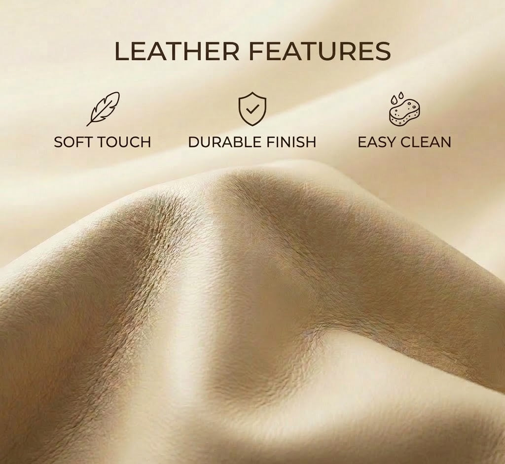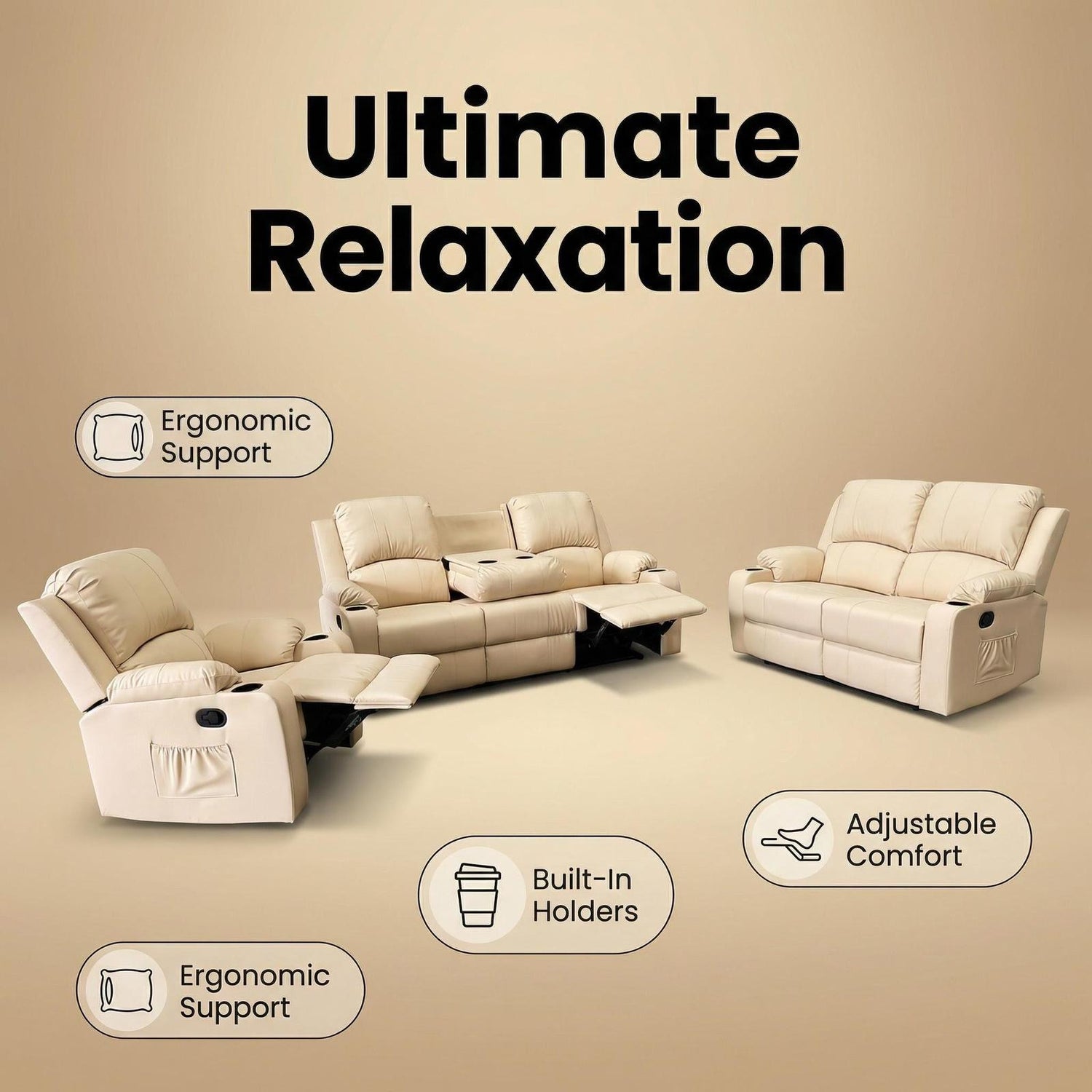Sink into pure comfort with the Cyril Recliner 3+2+1 seater in beige PVC set. This space-saving recliner delivers luxurious relaxation without dominating your room. The durable PVC upholstery offers easy maintenance while providing a sophisticated leather-like appearance. Transform your living space with this perfect blend of style and functionality – your body will thank you after a long day.